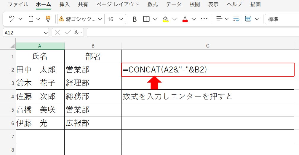 → A2とB2を「-」でつなげて表示します。