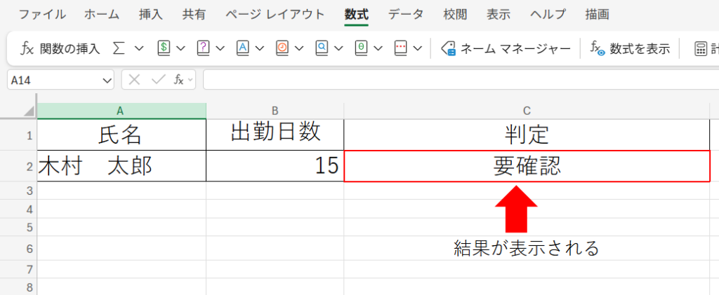 - 判定したい条件を考えます(例:出勤日数が20日以上かどうか)。