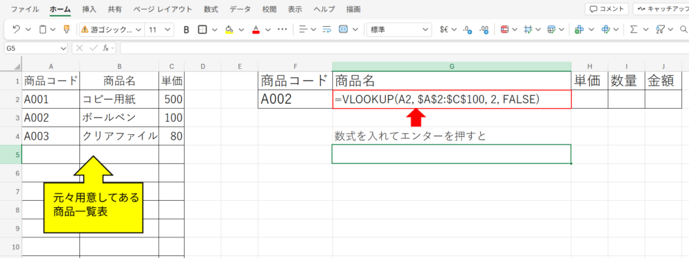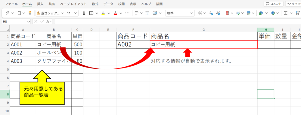今回は、A2の商品コードを表から探し、2列目の商品名を表示します。