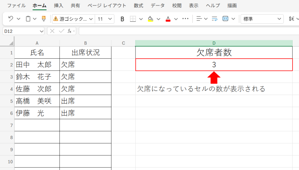 → 「欠席」と入力されているセルの数を表示します。